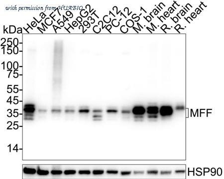 Western blot analysis of MFF on different lysates with Rabbit anti-MFF antibody (HA723630) at 1/25,000 dilution. Lane 1: HeLa cell lysate (10 µg/Lane) Lane 2: MCF7 cell lysate (10 µg/Lane) Lane 3: A549 cell lysate (10 µg/Lane) Lane 4: HepG2 cell lysate (10 µg/Lane) Lane 5: 293T cell lysate (10 µg/Lane) Lane 6: C2C12 cell lysate (10 µg/Lane) Lane 7: PC-12 cell lysate (10 µg/Lane) Lane 8: COS-1 cell lysate (10 µg/Lane) Lane 9: Mouse brain tissue lysate (20 µg/Lane) Lane 10: Mouse heart tissue lysate (20 µg/Lane) Lane 11: Rat brain tissue lysate (20 µg/Lane) Lane 12: Rat heart tissue lysate (20 µg/Lane) Predicted band size: 38 kDa Observed band size: 30-38 kDa Exposure time: 4 seconds; ECL: K1801; 4-20% SDS-PAGE gel. Proteins were transferred to a PVDF membrane and blocked with 5% NFDM/TBST for 1 hour at room temperature. The primary antibody (HA723630) at 1/25,000 dilution was used in primary antibody dilution (K1803) at 4℃ overnight. Goat Anti-Rabbit IgG - HRP Secondary Antibody (HA1001) at 1/50,000 dilution was used for 1 hour at room temperature.