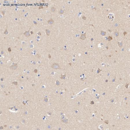 Immunohistochemical analysis of paraffin-embedded human brain tissue with Rabbit anti-MFF antibody (HA723630) at 1/5,000 dilution. The section was pre-treated using heat mediated antigen retrieval with Tris-EDTA buffer (pH 9.0) for 20 minutes. The tissues were blocked in 1% BSA for 20 minutes at room temperature, washed with ddH2O and PBS, and then probed with the primary antibody (HA723630) at 1/5,000 dilution for 1 hour at room temperature. The detection was performed using an HRP conjugated compact polymer system. DAB was used as the chromogen. Tissues were counterstained with hematoxylin and mounted with DPX.