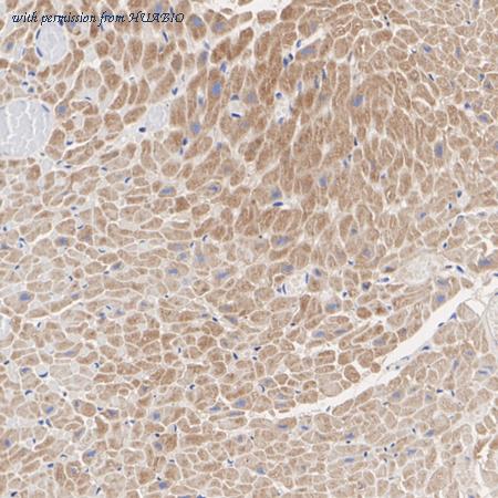 Immunohistochemical analysis of paraffin-embedded human heart tissue with Rabbit anti-MFF antibody (HA723630) at 1/5,000 dilution. The section was pre-treated using heat mediated antigen retrieval with Tris-EDTA buffer (pH 9.0) for 20 minutes. The tissues were blocked in 1% BSA for 20 minutes at room temperature, washed with ddH2O and PBS, and then probed with the primary antibody (HA723630) at 1/5,000 dilution for 1 hour at room temperature. The detection was performed using an HRP conjugated compact polymer system. DAB was used as the chromogen. Tissues were counterstained with hematoxylin and mounted with DPX.
