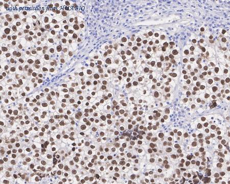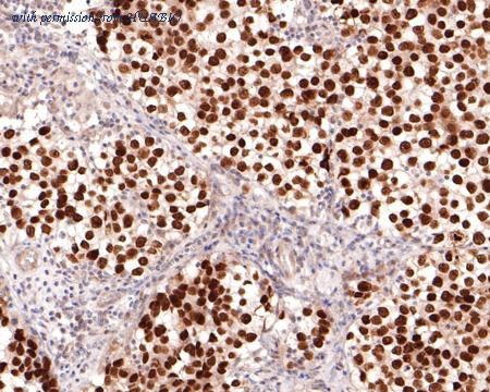 Immunohistochemical analysis of paraffin-embedded human seminoma tissue with Mouse anti-SALL4 antibody (HA601145) at 1/4,000 dilution. The section was pre-treated using heat mediated antigen retrieval with sodium citrate buffer (pH 6.0) (high pressure) for 2 minutes. The tissues were blocked in 1% BSA for 20 minutes at room temperature, washed with ddH2O and PBS, and then probed with the primary antibody (HA601145) at 1/4,000 dilution for 1 hour at room temperature. The detection was performed using an HRP conjugated compact polymer system. DAB was used as the chromogen. Tissues were counterstained with hematoxylin and mounted with DPX.