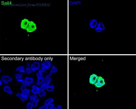 Immunocytochemistry analysis of NCCIT cells labeling Sall4 with Mouse anti-Sall4 antibody (HA600089) at 1/100 dilution. Cells were fixed in 4% paraformaldehyde for 30 minutes, permeabilized with 0.1% Triton X-100 in PBS for 15 minutes, and then blocked with 2% BSA for 30 minutes at room temperature. Cells were then incubated with Mouse anti-Sall4 antibody (HA600089) at 1/100 dilution in 2% BSA overnight at 4 ℃. Goat Anti-Mouse IgG H&L (iFluor™ 488, HA1125) was used as the secondary antibody at 1/1,000 dilution. PBS instead of the primary antibody was used as the secondary antibody only control. Nuclear DNA was labelled in blue with DAPI.
