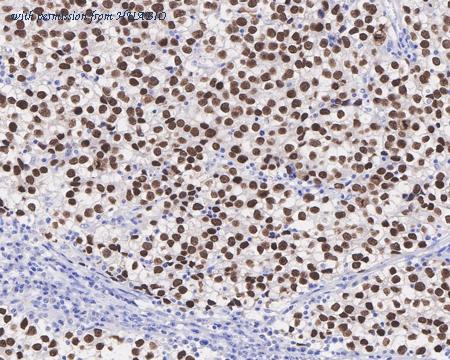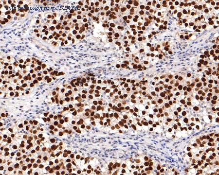 Immunohistochemical analysis of paraffin-embedded human seminoma tissue with Mouse anti-Sall4 antibody (HA601042) at 1/2,000 dilution. The section was pre-treated using heat mediated antigen retrieval with sodium citrate buffer (pH 6.0) (high pressure) for 2 minutes. The tissues were blocked in 1% BSA for 20 minutes at room temperature, washed with ddH2O and PBS, and then probed with the primary antibody (HA601042) at 1/2,000 dilution for 1 hour at room temperature. The detection was performed using an HRP conjugated compact polymer system. DAB was used as the chromogen. Tissues were counterstained with hematoxylin and mounted with DPX.