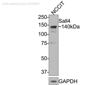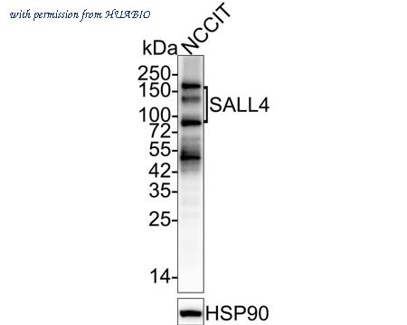 Western blot analysis of Sall4 on NCCIT cell lysates with Mouse anti-Sall4 antibody (HA601042) at 1/2,000 dilution. Lysates/proteins at 20 µg/Lane. Predicted band size: 112 kDa Observed band size: 140/110/75 kDa Exposure time: 3 minutes 20 seconds; 4-20% SDS-PAGE gel. Proteins were transferred to a PVDF membrane and blocked with 5% NFDM/TBST for 1 hour at room temperature. The primary antibody (HA601042) at 1/2,000 dilution was used in 5% NFDM/TBST at 4℃ overnight. Goat Anti-Mouse IgG - HRP Secondary Antibody (HA1006) at 1/50,000 dilution was used for 1 hour at room temperature.