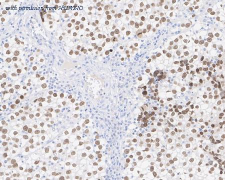 Immunohistochemical analysis of paraffin-embedded human testis tissue with Mouse anti-SALL4 antibody (HA601145) at 1/4,000 dilution. The section was pre-treated using heat mediated antigen retrieval with sodium citrate buffer (pH 6.0) (high pressure) for 2 minutes. The tissues were blocked in 1% BSA for 20 minutes at room temperature, washed with ddH2O and PBS, and then probed with the primary antibody (HA601145) at 1/4,000 dilution for 1 hour at room temperature. The detection was performed using an HRP conjugated compact polymer system. DAB was used as the chromogen. Tissues were counterstained with hematoxylin and mounted with DPX.