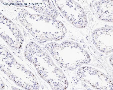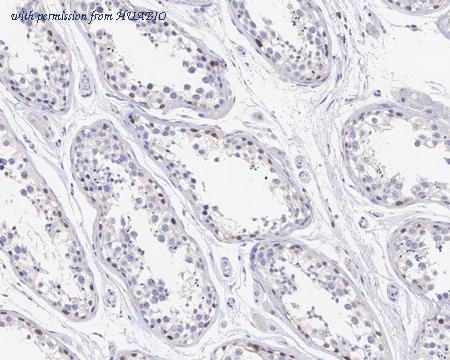 Immunohistochemical analysis of paraffin-embedded human testis tissue with Mouse anti-SALL4 antibody (HA601144) at 1/4,000 dilution. The section was pre-treated using heat mediated antigen retrieval with sodium citrate buffer (pH 6.0) (high pressure) for 2 minutes. The tissues were blocked in 1% BSA for 20 minutes at room temperature, washed with ddH2O and PBS, and then probed with the primary antibody (HA601144) at 1/4,000 dilution for 1 hour at room temperature. The detection was performed using an HRP conjugated compact polymer system. DAB was used as the chromogen. Tissues were counterstained with hematoxylin and mounted with DPX.