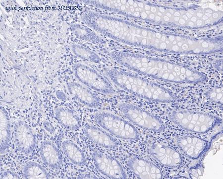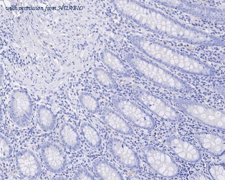 Immunohistochemical analysis of paraffin-embedded human appendix tissue (Negative) with Mouse anti-SALL4 antibody (HA601144) at 1/4,000 dilution. The section was pre-treated using heat mediated antigen retrieval with sodium citrate buffer (pH 6.0) (high pressure) for 2 minutes. The tissues were blocked in 1% BSA for 20 minutes at room temperature, washed with ddH2O and PBS, and then probed with the primary antibody (HA601144) at 1/4,000 dilution for 1 hour at room temperature. The detection was performed using an HRP conjugated compact polymer system. DAB was used as the chromogen. Tissues were counterstained with hematoxylin and mounted with DPX.
