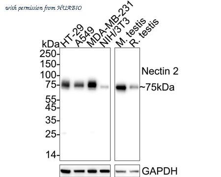 Western blot analysis of Nectin 2 on different lysates with Rabbit anti-Nectin 2 antibody (ET7108-95) at 1/5,000 dilution. Lane 1: HT-29 cell lysate Lane 2: A549 cell lysate Lane 3: MDA-MB-231 cell lysate Lane 4: NIH/3T3 cell lysate Lane 5: Mouse testis tissue lysate Lane 6: Rat testis tissue lysate Lysates/proteins at 20 µg/Lane. Predicted band size: 58 kDa Observed band size: 75 kDa Exposure time: 16 seconds; ECL: K1801; 4-20% SDS-PAGE gel. Proteins were transferred to a PVDF membrane and blocked with 5% NFDM/TBST for 1 hour at room temperature. The primary antibody (ET7108-95) at 1/5,000 dilution was used in 5% NFDM/TBST at 4℃ overnight. Goat Anti-Rabbit IgG - HRP Secondary Antibody (HA1001) at 1/50,000 dilution was used for 1 hour at room temperature.