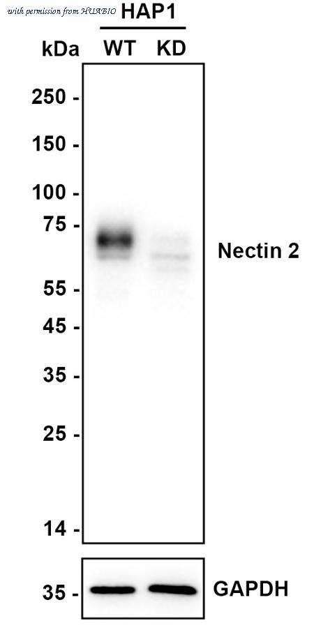 Western blot analysis of Nectin 2 on different lysates with Rabbit anti-Nectin 2 antibody (ET7108-95) at 1/10,000 dilution. Lane 1: HAP1-parental cell lysate Lane 2: HAP1-Nectin 2 KD cell lysate Lysates/proteins at 10 µg/Lane. Predicted band size: 58 kDa Observed band size: 70-85 kDa Exposure time: 10 seconds; ECL: K1801; 4-20% SDS-PAGE gel. Proteins were transferred to a PVDF membrane and blocked with 5% NFDM/TBST for 1 hour at room temperature. The primary antibody (ET7108-95) at 1/10,000 dilution was used in K1803 at 4℃ overnight. Goat Anti-Rabbit IgG - HRP Secondary Antibody (HA1001) at 1/50,000 dilution was used for 1 hour at room temperature.