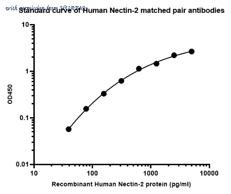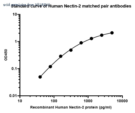 Sandwich ELISA analysis of human Nectin-2 matched pair antibodies Capture: HA723460, Human Nectin-2 Rabbit mAb [PSH11-54] Detector: HA723461, Human Nectin-2 Rabbit mAb [PSH12-52] Elisa assay was performed by coating wells of a 96-well plate with 50 µl per well of capture antibody (HA723460) diluted in carbonate/bicarbonate buffer, at a concentration of 1 µg/ml overnight at 4℃. Wells of the plate were washed, blocked with 150 µl 0.05% tween-20 1% BSA blocking buffer, and incubated with serial diluted Recombinant Human Nectin-2 protein (HA210905) starting from 5,000 pg/ml to 0 pg/ml and detect antibody (HA723461, Biotin, 0.05 µg/ml) for 1 hour at 30℃ with shaking. Then the plate was washed and incubated with 50 µl per well of SA-HRP for 0.5 hour at 30℃ with shaking. Detection was performed using an Ultra TMB Substrate for 10 minutes at room temperature in the dark. The reaction was stopped with sulfuric acid and absorbances were read on a spectrophotometer at 450 nm.