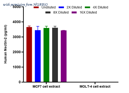 Interpolated concentrations of native Nectin-2 in MCF7 and MOLT-4 extract samples based on a 1,000 µg/ml extract load. Capture: HA723463, Human Nectin-2 Rabbit mAb [PSH12-53] Detector: HA723461, Human Nectin-2 Rabbit mAb [PSH12-52] The concentrations of Nectin-2 were measured in duplicates, interpolated from the Nectin-2 standard curve and corrected for sample dilution. Undiluted samples are MOLT-4 extract 50% and MCF7 extract 50%. The interpolated dilution factor corrected values are plotted (mean +/- SD, n=2). The mean Nectin-2 concentration was determined to be 4,062 pg/ml in MCF7 extract and undetectable in MOLT-4 extract.