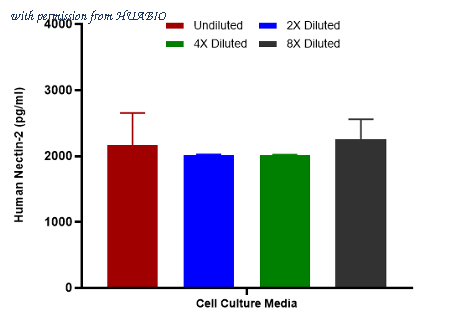 Interpolated concentrations of spiked Nectin-2 in human cell culture media samples. Capture: HA723463, Human Nectin-2 Rabbit mAb [PSH12-53] Detector: HA723461, Human Nectin-2 Rabbit mAb [PSH12-52] The concentrations of Nectin-2 were measured in duplicates, interpolated from the Nectin-2 standard curves and corrected for sample dilution. Undiluted samples are as follows: cell culture media 50%. The interpolated dilution factor corrected values are plotted (mean +/- SD, n=2).
