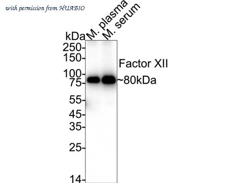 Western blot analysis of Factor XII on different lysates with Rabbit anti-Factor XII antibody (HA500586) at 1/5,000 dilution. Lane 1: Mouse plasma lysate Lane 2: Mouse serum lysate Lysates/proteins at 15 µg/Lane. Predicted band size: 66 kDa Observed band size: 80 kDa Exposure time: 10 seconds; ECL: K1801; 4-20% SDS-PAGE gel. Proteins were transferred to a PVDF membrane and blocked with 5% NFDM/TBST for 1 hour at room temperature. The primary antibody (HA500586) at 1/5,000 dilution was used in primary antibody dilution (K1803) at 4℃ overnight. Goat Anti-Rabbit IgG - HRP Secondary Antibody (HA1001) at 1/50,000 dilution was used for 1 hour at room temperature.
