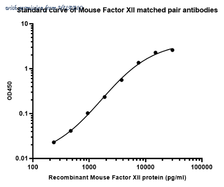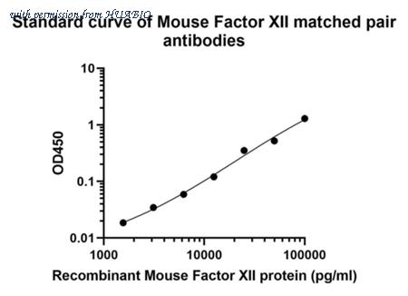 Sandwich ELISA analysis of Mouse Factor XII matched pair antibodies Capture: HA723440, Mouse Factor XII Rabbit mAb [PSH12-21] Detector: HA723441, Mouse Factor XII Rabbit mAb [PSH12-22] Elisa assay was performed by coating wells of a 96-well plate with 100 µl per well of capture antibody (HA723440) diluted in carbonate/bicarbonate buffer, at a concentration of 2ug/ml overnight at 4℃. Wells of the plate were washed, blocked with 150 µl 0.05% tween-20 1% BSA blocking buffer, and incubated with serial diluted Recombinant Mouse Factor XII protein (HA210984) starting from 18,000 pg/ml to 0 pg/ml and detect antibody (HA723441, Biotin, 0.2 µg/ml) for 1 hour at 30℃ with shaking. Then the plate was washed and incubated with 100 µl per well of SA-HRP for 0.5 hour at 30℃ with shaking. Detection was performed using an Ultra TMB Substrate for 10 minutes at room temperature in the dark. The reaction was stopped with sulfuric acid and absorbances were read on a spectrophotometer at 450 nm.
