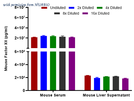 Interpolated concentrations of native Factor XII in mouse samples. Capture: HA723443, Mouse/Rat Factor XII Rabbit mAb [PSH12-21] Detector: HA723444, Mouse/Rat Factor XII Rabbit mAb [PSH12-23] Interpolated concentration of native Factor XII was measured in duplicate at different sample concentrations. The interpolated dilution factor corrected values were plotted (mean +/- SD, n=2). The mean Factor XII concentration was determined to be 22,555,940 pg/mL in mouse serum and 20,935 pg/ml in mouse liver Supernatant.