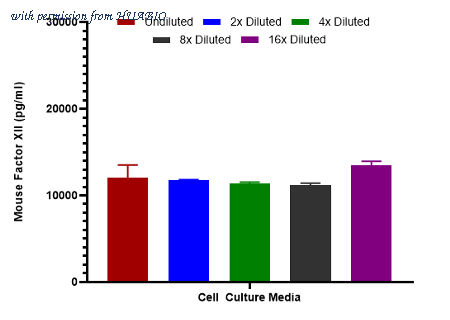 Interpolated concentrations of spiked Factor XII in cell culture media samples. Capture: HA723443, Mouse/Rat Factor XII Rabbit mAb [PSH12-21] Detector: HA723444, Mouse/Rat Factor XII Rabbit mAb [PSH12-23] The concentrations of Factor XII were measured in duplicates, interpolated from the Factor XII standard curves and corrected for sample dilution. Undiluted samples are as follows: cell culture media 50%. The interpolated dilution factor corrected values are plotted (mean +/- SD, n=2).
