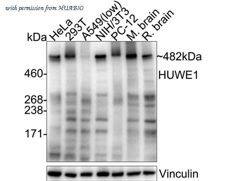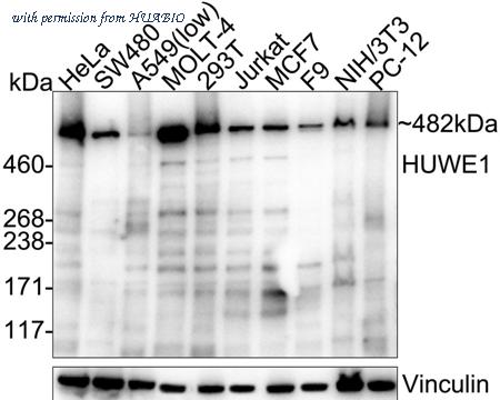 Western blot analysis of HUWE1 on different lysates with Rabbit anti-HUWE1 antibody (HA723631) at 1/5,000 dilution. Lane 1: HeLa cell lysate (20 µg/Lane) Lane 2: SW480 cell lysate (20 µg/Lane) Lane 3: A549 cell lysate (low expression) (20 µg/Lane) Lane 4: MOLT-4 cell lysate (20 µg/Lane) Lane 5: 293T cell lysate (20 µg/Lane) Lane 6: Jurkat cell lysate (20 µg/Lane) Lane 7: MCF7 cell lysate (20 µg/Lane) Lane 8: F9 cell lysate (20 µg/Lane) Lane 9: NIH/3T3 cell lysate (20 µg/Lane) Lane 10: PC-12 cell lysate (20 µg/Lane) Predicted band size: 482 kDa Observed band size: 482 kDa Exposure time: 25 seconds; ECL: K1801; 3-8% SDS-PAGE gel. Proteins were transferred to a PVDF membrane and blocked with 5% NFDM/TBST for 1 hour at room temperature. The primary antibody (HA723631) at 1/5,000 dilution was used in primary antibody dilution (K1803) at 4℃ overnight. Goat Anti-Rabbit IgG - HRP Secondary Antibody (HA1001) at 1/50,000 dilution was used for 1 hour at room temperature.