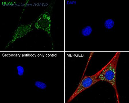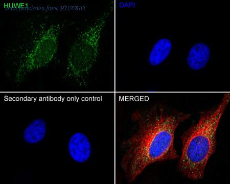 Immunocytochemistry analysis of HeLa cells labeling HUWE1 with Rabbit anti-HUWE1 antibody (ER61660) at 1/100 dilution. Cells were fixed in 4% paraformaldehyde for 15 minutes at room temperature, permeabilized with 0.1% Triton X-100 in PBS for 15 minutes at room temperature, then blocked with 1% BSA in 10% negative goat serum for 1 hour at room temperature. Cells were then incubated with Rabbit anti-HUWE1 antibody (ER61660) at 1/100 dilution in 1% BSA in PBST overnight at 4 ℃. Goat Anti-Rabbit IgG H&L (iFluor™ 488, HA1121) was used as the secondary antibody at 1/1,000 dilution. PBS instead of the primary antibody was used as the secondary antibody only control. Nuclear DNA was labelled in blue with DAPI. Beta tubulin (HA601187, red) was stained at 1/100 dilution overnight at +4℃. Goat Anti-Mouse IgG H&L (iFluor™ 594, HA1126) was used as the secondary antibody at 1/1,000 dilution.