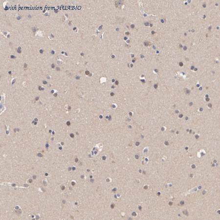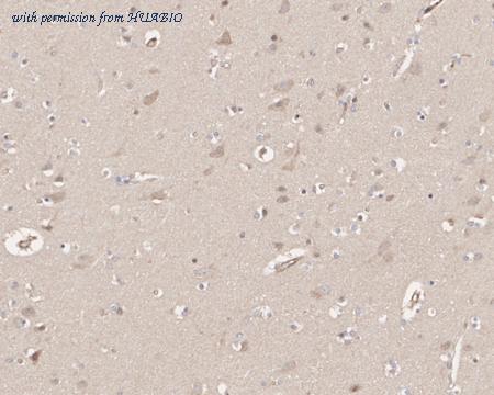 Immunohistochemical analysis of paraffin-embedded human brain tissue with Rabbit anti-HUWE1 antibody (HA723631) at 1/50 dilution. The section was pre-treated using heat mediated antigen retrieval with Tris-EDTA buffer (pH 9.0) for 20 minutes. The tissues were blocked in 1% BSA for 20 minutes at room temperature, washed with ddH2O and PBS, and then probed with the primary antibody (HA723631) at 1/50 dilution for 1 hour at room temperature. The detection was performed using an HRP conjugated compact polymer system. DAB was used as the chromogen. Tissues were counterstained with hematoxylin and mounted with DPX.