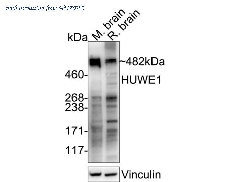 Western blot analysis of HUWE1 on different lysates with Rabbit anti-HUWE1 antibody (HA751519) at 1/20,000 dilution. Lane 1: Mouse brain tissue lysate (40 µg/Lane) Lane 2: Rat brain tissue lysate (40 µg/Lane) Predicted band size: 482 kDa Observed band size: 482 kDa Exposure time: 48 seconds; ECL: K1801; 3-8% SDS-PAGE gel. Proteins were transferred to a PVDF membrane and blocked with 5% NFDM/TBST for 1 hour at room temperature. The primary antibody (HA751519) at 1/20,000 dilution was used in primary antibody dilution (K1803) at 4℃ overnight. Goat Anti-Rabbit IgG - HRP Secondary Antibody (HA1001) at 1/50,000 dilution was used for 1 hour at room temperature.