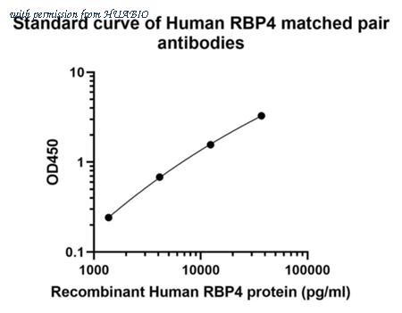 Sandwich ELISA analysis of Human RBP4 matched pair antibodies Capture: HA723688, Human RBP4 Rabbit mAb [PSH14-88] Detector: HA723689, Human RBP4 Rabbit mAb [PSH14-89] Elisa assay was performed by coating wells of a 96-well plate with 100 µl per well of capture antibody (HA723688) diluted in carbonate/bicarbonate buffer, at a concentration of 0.5ug/ml overnight at 4℃. Wells of the plate were washed, blocked with 150 µl 0.05% tween-20 1% BSA blocking buffer, and incubated with serial diluted Recombinant Human RBP4 protein (HA210999) starting from 37,000 pg/ml to 0 pg/ml and detect antibody (HA723689, HRP, 0.5 µg/ml) for 1 hour at 30℃ with shaking. Detection was performed using an Ultra TMB Substrate for 10 minutes at room temperature in the dark. The reaction was stopped with sulfuric acid and absorbances were read on a spectrophotometer at 450 nm.
