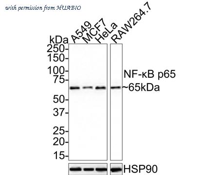 Western blot analysis of NF-kB p65 on different lysates with Rabbit anti-NF-kB p65 antibody (HA750058) at 1/5,000 dilution. Lane 1: A549 cell lysate Lane 2: MCF7 cell lysate Lane 3: HeLa cell lysate Lane 4: RAW264.7 cell lysate Lysates/proteins at 15 µg/Lane. Predicted band size: 65 kDa Observed band size: 65 kDa Exposure time: 49 seconds; ECL: K1801; 4-20% SDS-PAGE gel. Proteins were transferred to a PVDF membrane and blocked with 5% NFDM/TBST for 1 hour at room temperature. The primary antibody (HA750058) at 1/5,000 dilution was used in 5% NFDM/TBST at room temperature for 2 hours. Goat Anti-Rabbit IgG - HRP Secondary Antibody (HA1001) at 1:100,000 dilution was used for 1 hour at room temperature.