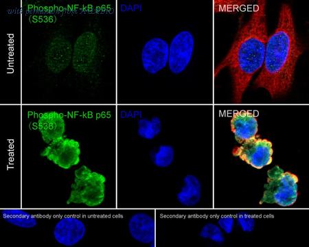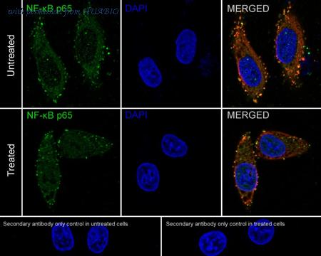 Immunocytochemistry analysis of HeLa cells untreated / treated with 100nM Calyculin A and 20ng/mL TNF-α for 15 minutes labeling Phospho-NF-kB p65 (S536) with Rabbit anti-Phospho-NF-kB p65 (S536) antibody (HA751361) at 1/500 dilution. Cells were fixed in 4% paraformaldehyde for 15 minutes at room temperature, permeabilized with 0.1% Triton X-100 in PBS for 15 minutes at room temperature, then blocked with 1% BSA in 10% negative goat serum for 1 hour at room temperature. Cells were then incubated with Rabbit anti-Phospho-NF-kB p65 (S536) antibody (HA751361) at 1/500 dilution in 1% BSA in PBST overnight at 4 ℃. Goat Anti-Rabbit IgG H&L (iFluor™ 488, HA1121) was used as the secondary antibody at 1/1,000 dilution. PBS instead of the primary antibody was used as the secondary antibody only control. Nuclear DNA was labelled in blue with DAPI. Beta tubulin (HA601187, red) was stained at 1/100 dilution overnight at +4℃. Goat Anti-Mouse IgG H&L (iFluor™ 594, HA1126) was used as the secondary antibody at 1/1,000 dilution.