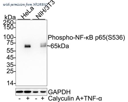 Western blot analysis of Phospho-NF-kB p65 (S536) on different lysates with Rabbit anti-Phospho-NF-kB p65 (S536) antibody (HA723223) at 1/5,000 dilution. Lane 1: HeLa cell lysate (20 µg/Lane) Lane 2: HeLa treated with 100nM Calyculin A and 20ng/mL TNF-α for 10 minutes cell lysate (20 µg/Lane) Lane 3: NIH/3T3 cell lysate (20 µg/Lane) Lane 4: NIH/3T3 treated with 100nM Calyculin A and 20ng/mL TNF-α for 10 minutes cell lysate (20 µg/Lane) Predicted band size: 60 kDa Observed band size: 65 kDa Exposure time: 59 seconds; ECL: K1801; 4-20% SDS-PAGE gel. Proteins were transferred to a PVDF membrane and blocked with 5% NFDM/TBST for 1 hour at room temperature. The primary antibody (HA723223) at 1/5,000 dilution was used in 5% NFDM/TBST at 4℃ overnight. Goat Anti-Rabbit IgG - HRP Secondary Antibody (HA1001) at 1/50,000 dilution was used for 1 hour at room temperature.