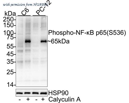 Western blot analysis of Phospho-NF-kB p65 (S536) on different lysates with Rabbit anti-Phospho-NF-kB p65 (S536) antibody (HA723223) at 1/5,000 dilution. Lane 1: C6 cell lysate (20 µg/Lane) Lane 2: C6 treated with 100ng/mL Calyculin A for 1 hour cell lysate (20 µg/Lane) Lane 3: PC-12 cell lysate (20 µg/Lane) Lane 4: PC-12 treated with 100nM Calyculin A for 30 minutes cell lysate (20 µg/Lane) Predicted band size: 60 kDa Observed band size: 65 kDa Exposure time: 59 seconds; ECL: K1801; 4-20% SDS-PAGE gel. Proteins were transferred to a PVDF membrane and blocked with 5% NFDM/TBST for 1 hour at room temperature. The primary antibody (HA723223) at 1/5,000 dilution was used in primary antibody dilution (K1803) at 4℃ overnight. Goat Anti-Rabbit IgG - HRP Secondary Antibody (HA1001) at 1/50,000 dilution was used for 1 hour at room temperature.