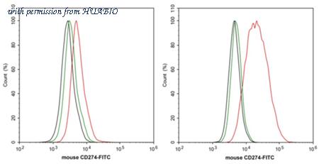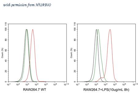 Flow cytometric analysis of RAW264.7 cells treated with or without 10μg/mL LPS for 8 hours labeling Mouse PD-L1. Cells were washed twice with cold PBS and resuspend. Then incubated for 1 hour at +4℃ with Mouse PD-L1 (HA720213F, red, 1μg/mL) and Rabbit IgG Isotype Control (FITC, green, 1μg/mL). Unlabelled sample was used as a control (cells without incubation with primary antibody; black).