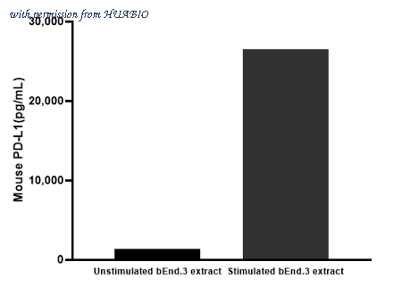 bEnd.3 cells were stimulated with 100 ng/ml mouse IFN-γ or vehicle control in 90%DMEM-H+10%FBS medium and incubated for 48 hours.The concentrations of PD-L1 were interpolated from the PD-L1 standard curves and corrected for sample dilution.Undiluted samples are mouse IFN-γ stimulated bEnd.3 cell extract 10% and unstimulated bEnd.3 cell extract 10%. The mean PD-L1 concentration was determined to be 26,524 pg/ml in mouse IFN-γ stimulated bEnd.3 cell extract and 1,337 pg/ml in the unstimulated bEnd.3 cell extract control.