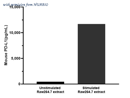 Raw264.7 cells were stimulated with 100 ng/ml mouse IFN-γ or vehicle control in DMEM-H+10%FBS medium and incubated for 48 hours.The concentrations of PD-L1 were interpolated from the PD-L1 standard curves and corrected for sample dilution.Undiluted samples are mouse IFN-γ stimulated Raw264.7 cell extract 10% and unstimulated Raw264.7 cell extract 10%. The mean PD-L1 concentration was determined to be 11,723 pg/ml in mouse IFN-γ stimulated Raw264.7 cell extract and 471 pg/ml in the unstimulated Raw264.7 cell extract control.
