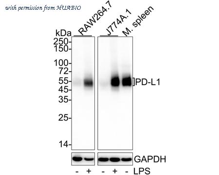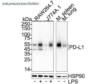 Western blot analysis of PD-L1 on different lysates with Rabbit anti-PD-L1 antibody (HA751459) at 1/2,000 dilution. Lane 1: RAW264.7 cell lysate Lane 2: RAW264.7 treated with 10μg/mL LPS for 8 hours cell lysate Lane 3: J774A.1 cell lysate Lane 4: J774A.1 treated with 1μg/mL LPS for 24 hours cell lysate Lane 5: Mouse spleen tissue lysate Lane 6: Mouse lung tissue lysate Lysates/proteins at 20 µg/Lane. Predicted band size: 33 kDa Observed band size: 45-55 kDa Exposure time: 59 seconds; ECL: K1802; 4-20% SDS-PAGE gel. Proteins were transferred to a PVDF membrane and blocked with 5% NFDM/TBST for 1 hour at room temperature. The primary antibody (HA751459) at 1/2,000 dilution was used in 5% NFDM/TBST at 4℃ overnight. Goat Anti-Rabbit IgG - HRP Secondary Antibody (HA1001) at 1/50,000 dilution was used for 1 hour at room temperature.