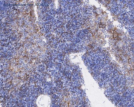 Immunohistochemical analysis of paraffin-embedded mouse thymus tissue with Rabbit anti-PD-L1 antibody (HA750974) at 1/200 dilution. The section was pre-treated using heat mediated antigen retrieval with Tris-EDTA buffer (pH 9.0) for 20 minutes. The tissues were blocked in 1% BSA for 20 minutes at room temperature, washed with ddH2O and PBS, and then probed with the primary antibody (HA750974) at 1/200 dilution for 1 hour at room temperature. The detection was performed using an HRP conjugated compact polymer system. DAB was used as the chromogen. Tissues were counterstained with hematoxylin and mounted with DPX.