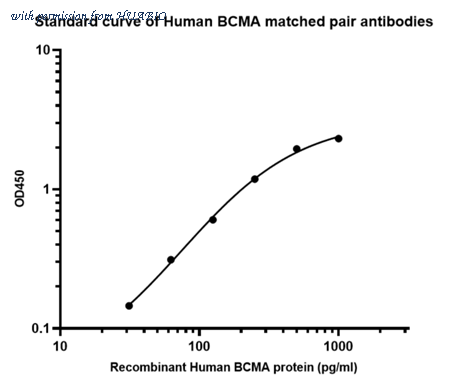Sandwich ELISA analysis of Human BCMA matched pair antibodies Capture: HA725082, Human BCMA Rabbit mAb [PSH13-18] Detector: HA725083, Human BCMA Rabbit mAb [PSH13-19] Elisa assay was performed by coating wells of a 96-well plate with 100 µl per well of capture antibody (HA725082) diluted in carbonate/bicarbonate buffer, at a concentration of 2ug/ml overnight at 4℃. Wells of the plate were washed, blocked with 150 µl 0.05% tween-20 1% BSA blocking buffer, and incubated with serial diluted Recombinant Human BCMA protein (HA210968) starting from 4,000 pg/ml to 0 pg/ml and detect antibody (HA725083, Biotin, 0.2 µg/ml) for 1 hour at 30℃ with shaking. Then the plate was washed and incubated with 100 µl per well of SA-HRP for 0.5 hour at 30℃ with shaking. Detection was performed using an Ultra TMB Substrate for 10 minutes at room temperature in the dark. The reaction was stopped with sulfuric acid and absorbances were read on a spectrophotometer at 450 nm.