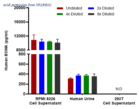 Interpolated concentrations of native BCMA in human samples. Capture: HA725082, Human BCMA Rabbit mAb [PSH13-18] Detector: HA725083, Human BCMA Rabbit mAb [PSH13-19] Interpolated concentration of native BCMA was measured in duplicate at different sample concentrations. The interpolated dilution factor corrected values were plotted (mean +/- SD, n=2). The mean BCMA concentration was determined to be 10,453 pg/mL in RPMI 8226 and 351 pg/ml in human urine. There was no detectable signal in 293T cell culture supernatant.