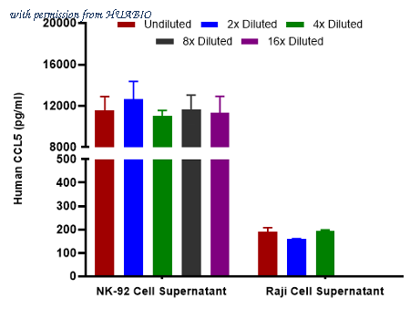 Interpolated concentrations of native CCL5 in human samples. Capture: HA725055, Human CCL5 Rabbit mAb [PSH13-16] Detector: HA725056, Human CCL5 Rabbit mAb [PSH13-17] Interpolated concentration of native CCL5 was measured in duplicate at different sample concentrations and interpolated from the CCL5 standard curves. Undiluted samples were 2% human serum and 100% cell supernatant. The interpolated dilution factor corrected values were plotted (mean +/- SD, n=2). The mean CCL5 concentration was determined to be 11,647 pg/mL in NK-92 and 182 pg/ml in Raji cell supernatant.