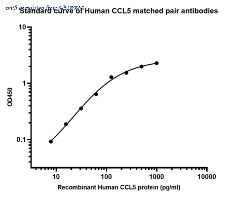 Sandwich ELISA analysis of Human CCL5 matched pair antibodies Capture: HA725055, Human CCL5 Rabbit mAb [PSH13-16] Detector: HA725056, Human CCL5 Rabbit mAb [PSH13-17] Elisa assay was performed by coating wells of a 96-well plate with 100 µl per well of capture antibody (HA725055) diluted in carbonate/bicarbonate buffer, at a concentration of 2ug/ml overnight at 4℃. Wells of the plate were washed, blocked with 150 µl 0.05% tween-20 1% BSA blocking buffer, and incubated with serial diluted Recombinant Human CCL5 protein (HA210998) starting from 1,000 pg/ml to 0 pg/ml and detect antibody (HA725056, Biotin, 0.2 µg/ml) for 1 hour at 30℃ with shaking. Then the plate was washed and incubated with 100 µl per well of SA-HRP for 0.5 hour at 30℃ with shaking. Detection was performed using an Ultra TMB Substrate for 10 minutes at room temperature in the dark. The reaction was stopped with sulfuric acid and absorbances were read on a spectrophotometer at 450 nm.