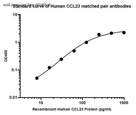 Sandwich ELISA analysis of Human CCL23 matched pair antibodies Elisa assay was performed by coating wells of a 96-well plate with 100 µl per well of capture antibody (HA723061) diluted in carbonate/bicarbonate buffer, at a concentration of 5ug/ml overnight at 4℃. Wells of the plate were washed, blocked with 150 µl 0.05% tween-20 1% BSA blocking buffer, and incubated with serial diluted Human CCL23 (HA210894) starting from 1,000 pg/ml to 0 pg/ml and detect antibody (HA723063, Biotin, 0.2 µg/ml) for 1 hour at 30℃ with shaking. Then the plate was washed and incubated with 100 µl per well of SA-HRP for 0.5 hour at 30℃ with shaking. Detection was performed using an Ultra TMB Substrate for 10 minutes at room temperature in the dark. The reaction was stopped with sulfuric acid and absorbances were read on a spectrophotometer at 450 nm.