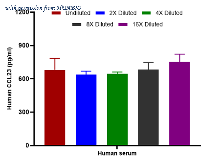 Interpolated concentrations of native CCL23 in human serum samples. The concentrations of CCL23 were measured in duplicates, interpolated from the CCL23 standard curve and corrected for sample dilution. Undiluted samples are human serum 100%. The interpolated dilution factor corrected values are plotted (mean +/- SD, n=2). The mean CCL23 concentration was determined to be 673.4 pg/ml in human serum.