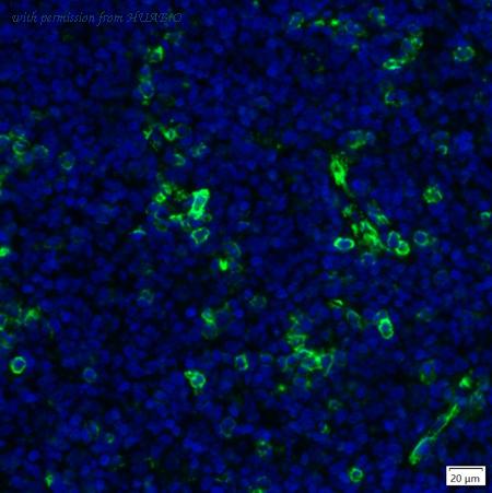 mIHC analysis of human tonsil tissue (Formalin/PFA-fixed paraffin-embedded sections) with Rabbit anti-Syndecan 1 antibody (IRS105RB) at 1/100 dilution. The immunostaining was performed with the IRISKitCmTSA Kit (900808). Heat mediated antigen retrieval with Tris-EDTA buffer (pH 9.0) for 30 mins at 95℃. DAPI (blue) was used as a nuclear counter stain. Image acquisition was performed with Olympus VS200 Slide Scanner.