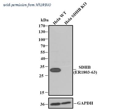 All lanes: Western blot analysis of SDHB with anti-SDHB antibody (ER1803-63) at 1/1,000 dilution. Lane 1: Wild-type Hela whole cell lysate. Lane 2: SDHB knockout Hela whole cell lysate. ER1803-63 was shown to specifically react with SDHB in wild-type Hela cells. No band was observed when SDHB knockout sample was tested. Wild-type and SDHB knockout samples were subjected to SDS-PAGE. Proteins were transferred to a PVDF membrane and blocked with 5% NFDM in TBST for 1 hour at room temperature. The primary Anti-SDHB antibody (ER1803-63, 1/1,000) and Anti-GAPDH antibody (ET1601-4, 1/10,000) were used in 5% BSA at room temperature for 2 hours. Goat Anti-Rabbit IgG H&L (HRP) Secondary Antibody (HA1001) at 1:200,000 dilution was used for 1 hour at room temperature. Cell lysate was provided by Ubigene Biosciences (Ubigene Biosciences Co., Ltd., Guangzhou, China).