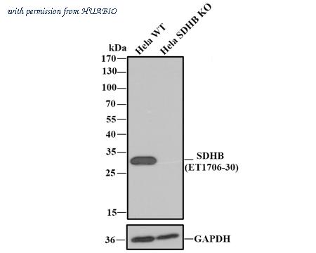 All lanes: Western blot analysis of SDHB with anti-SDHB antibody [JU02-33] (ET1706-30) at 1:1,000 dilution. Lane 1: Wild-type Hela whole cell lysate. Lane 2: SDHB knockout Hela whole cell lysate. ET1706-30 was shown to specifically react with SDHB in wild-type Hela cells. No band was observed when SDHB knockout samples were tested. Wild-type and SDHB knockout samples were subjected to SDS-PAGE. Proteins were transferred to a PVDF membrane and blocked with 5% NFDM in TBST for 1 hour at room temperature. The primary Anti-SDHB antibody (ET1706-30, 1/1,000) and Anti-GAPDH antibody (ET1601-4, 1/10,000) were used in 5% BSA at room temperature for 2 hours. Goat Anti-Rabbit IgG H&L (HRP) Secondary Antibody (HA1001) at 1:200,000 dilution was used for 1 hour at room temperature. Cell lysate was provided by Ubigene Biosciences (Ubigene Biosciences Co., Ltd., Guangzhou, China).