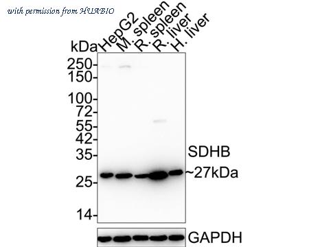 Western blot analysis of SDHB on different lysates with Rabbit anti-SDHB antibody (ET1706-30) at 1/1,000 dilution. Lane 1: HepG2 cell lysate (20 µg/Lane) Lane 2: Mouse spleen tissue lysate (40 µg/Lane) Lane 3: Rat spleen tissue lysate (40 µg/Lane) Lane 4: Rat liver tissue lysate (40 µg/Lane) Lane 5: Human liver tissue lysate (40 µg/Lane) Predicted band size: 32 kDa Observed band size: 27 kDa Exposure time: 24 seconds; ECL: K1801; 4-20% SDS-PAGE gel. Proteins were transferred to a PVDF membrane and blocked with 5% NFDM/TBST for 1 hour at room temperature. The primary antibody (ET1706-30) at 1/1,000 dilution was used in 5% NFDM/TBST at 4℃ overnight. Goat Anti-Rabbit IgG - HRP Secondary Antibody (HA1001) at 1/50,000 dilution was used for 1 hour at room temperature.