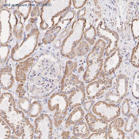 Immunohistochemical analysis of paraffin-embedded human kidney tissue with Rabbit anti-SDHB antibody (ET1706-30) at 1/1,000 dilution. The section was pre-treated using heat mediated antigen retrieval with Tris-EDTA buffer (pH 9.0) for 20 minutes. The tissues were blocked in 1% BSA for 20 minutes at room temperature, washed with ddH2O and PBS, and then probed with the primary antibody (ET1706-30) at 1/1,000 dilution for 1 hour at room temperature. The detection was performed using an HRP conjugated compact polymer system. DAB was used as the chromogen. Tissues were counterstained with hematoxylin and mounted with DPX.