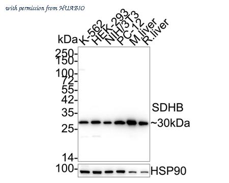 Western blot analysis of SDHB on different lysates with Rabbit anti-SDHB antibody (HA722901) at 1/2,000 dilution. Lane 1: K-562 cell lysate Lane 2: HEK-293 cell lysate Lane 3: NIH/3T3 cell lysate Lane 4: PC-12 cell lysate Lane 5: Mouse liver tissue lysate Lane 6: Rat liver tissue lysate Lysates/proteins at 20 µg/Lane. Predicted band size: 32 kDa Observed band size: 30 kDa Exposure time: 4 seconds; ECL: K1801; 4-20% SDS-PAGE gel. Proteins were transferred to a PVDF membrane and blocked with 5% NFDM/TBST for 1 hour at room temperature. The primary antibody (HA722901) at 1/2,000 dilution was used in 5% NFDM/TBST at 4℃ overnight. Goat Anti-Rabbit IgG - HRP Secondary Antibody (HA1001) at 1/50,000 dilution was used for 1 hour at room temperature.