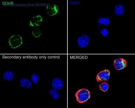 Immunocytochemistry analysis of K-562 cells labeling SDHB with Rabbit anti-SDHB antibody (HA722901) at 1/250 dilution. Cells were fixed in 4% paraformaldehyde for 15 minutes at room temperature, permeabilized with 0.1% Triton X-100 in PBS for 15 minutes at room temperature, then blocked with 1% BSA in 10% negative goat serum for 1 hour at room temperature. Cells were then incubated with Rabbit anti-SDHB antibody (HA722901) at 1/250 dilution in 1% BSA in PBST overnight at 4 ℃. Goat Anti-Rabbit IgG H&L (iFluor™ 488, HA1121) was used as the secondary antibody at 1/1,000 dilution. PBS instead of the primary antibody was used as the secondary antibody only control. Nuclear DNA was labelled in blue with DAPI. Beta tubulin (HA601187, red) was stained at 1/100 dilution overnight at +4℃. Goat Anti-Mouse IgG H&L (iFluor™ 594, HA1126) was used as the secondary antibody at 1/1,000 dilution.