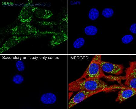 Immunocytochemistry analysis of NIH/3T3 cells labeling SDHB with Rabbit anti-SDHB antibody (HA722901) at 1/250 dilution. Cells were fixed in 4% paraformaldehyde for 15 minutes at room temperature, permeabilized with 0.1% Triton X-100 in PBS for 15 minutes at room temperature, then blocked with 1% BSA in 10% negative goat serum for 1 hour at room temperature. Cells were then incubated with Rabbit anti-SDHB antibody (HA722901) at 1/250 dilution in 1% BSA in PBST overnight at 4 ℃. Goat Anti-Rabbit IgG H&L (iFluor™ 488, HA1121) was used as the secondary antibody at 1/1,000 dilution. PBS instead of the primary antibody was used as the secondary antibody only control. Nuclear DNA was labelled in blue with DAPI. Beta tubulin (HA601187, red) was stained at 1/100 dilution overnight at +4℃. Goat Anti-Mouse IgG H&L (iFluor™ 594, HA1126) was used as the secondary antibody at 1/1,000 dilution.