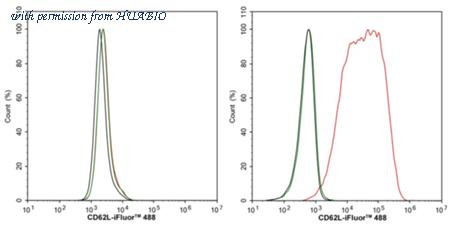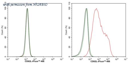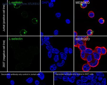 Flow cytometric analysis of 293T (left, negative) and Jurkat (right, positive) cells labeling CD62L.