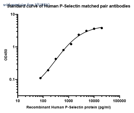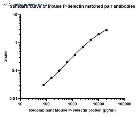 Sandwich ELISA analysis of mouse P-Selectin matched pair antibodies Capture: HA723872, P-Selectin / CD62P Rabbit mAb [PSH16-70] Detector: HA723873, P-Selectin / CD62P Rabbit mAb [PSH16-71] Elisa assay was performed by coating wells of a 96-well plate with 100 µl per well of capture antibody (HA723872) diluted in carbonate/bicarbonate buffer, at a concentration of 2 µg/ml overnight at 4℃. Wells of the plate were washed, blocked with 150 µl 0.05% tween-20 1% BSA blocking buffer, and incubated with serial diluted Recombinant Mouse P-Selectin / CD62P protein (HA211140) starting from 20,000 pg/ml to 0 pg/ml and detect antibody (HA723873, Biotin, 0.2 µg/ml) for 1 hour at 30℃ with shaking. Then the plate was washed and incubated with 100 µl per well of SA-HRP for 0.5 hour at 30℃ with shaking. Detection was performed using an Ultra TMB Substrate for 10 minutes at room temperature in the dark. The reaction was stopped with sulfuric acid and absorbances were read on a spectrophotometer at 450 nm.