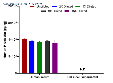 Interpolated concentrations of native P-Selectin in human serum samples and HeLa cell culture supernatant. Capture: HA723872, P-Selectin / CD62P Rabbit mAb [PSH16-70] Detector: HA723873, P-Selectin / CD62P Rabbit mAb [PSH16-71] The concentrations of P-Selectin were measured in triplicates, interpolated from the P-Selectin standard curve and corrected for sample dilution. Undiluted samples are human serum 5% and HeLa cell culture supernatant 50%. The interpolated dilution factor corrected values are plotted (mean +/- SD, n=3). The mean P-Selectin concentration was determined to be 95,663 pg/ml in human serum and undetectable in HeLa cell culture supernatant.